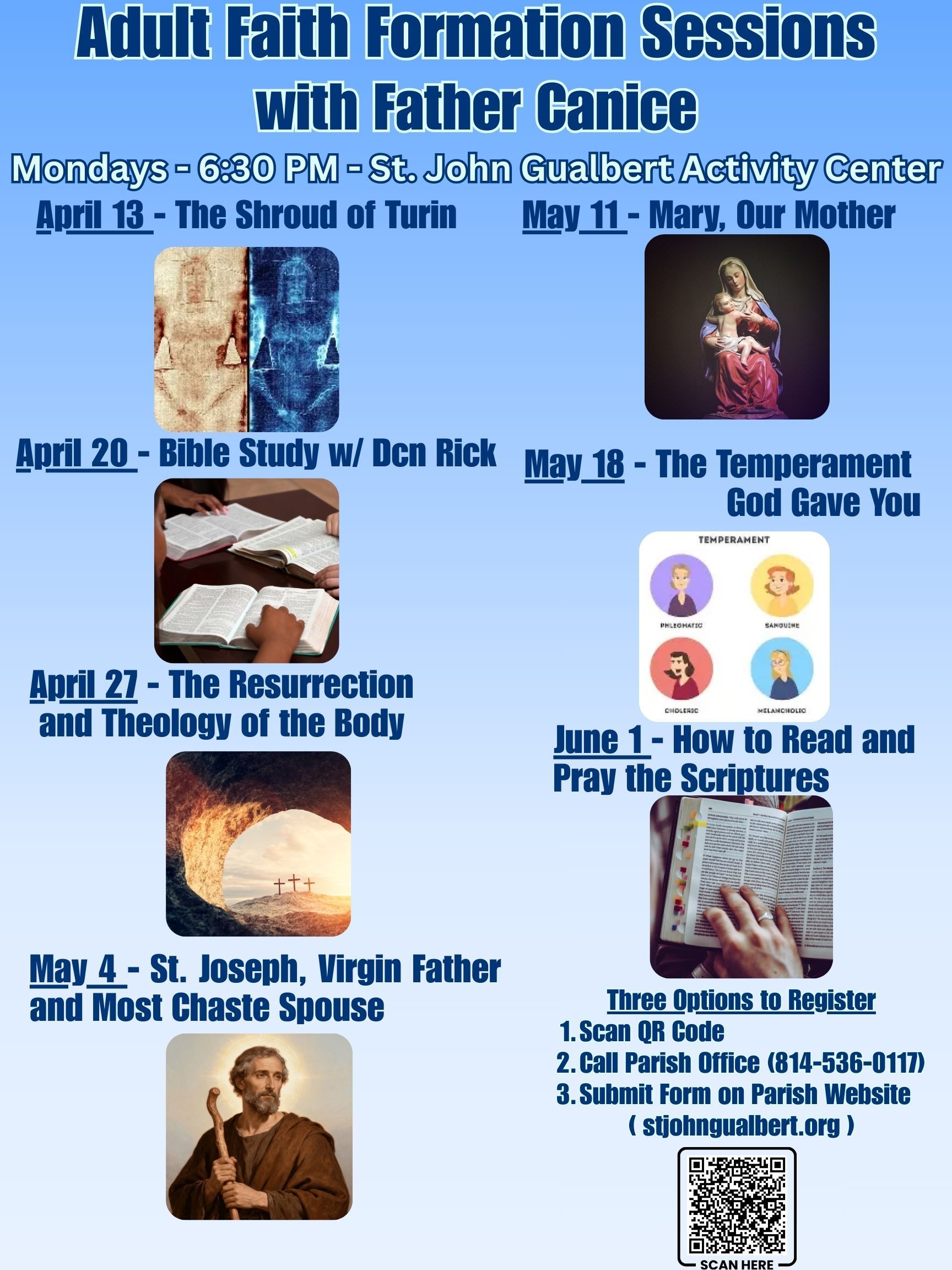 Join us for Adult Faith Formation Sessions with Father Canice! Mondays at 6:30 PM at the Saint John Gualbert Activity Center! Submit the form below or call the parish office to register for sessions of interest!